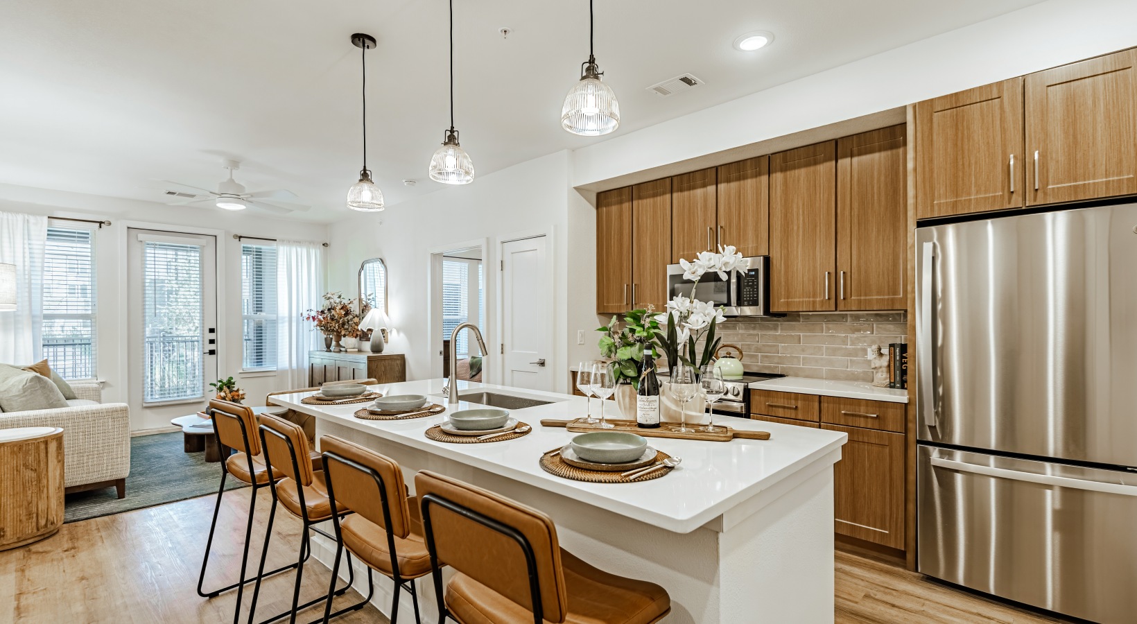 Preview the open layouts, wood-style flooring, and light-filled interiors in our apartments near Austin, TX, designed for your comfort and daily convenience. Enjoy slow mornings in your sleek kitchen, afternoons by the resort-style pool, and evenings in the resident clubhouse lounge. At Bevelo Larkspur apartments, everyday moments feel effortlessly elevated.